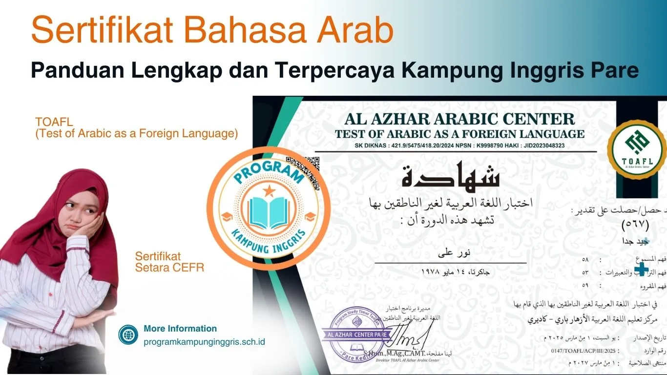 A: Sertifikat Bahasa Arab adalah dokumen resmi yang menunjukkan kemahiran seseorang dalam bahasa Arab berdasarkan standar internasional seperti TOAFL atau CEFR. Sertifikat ini digunakan sebagai bukti kompetensi bahasa untuk keperluan studi, kerja, beasiswa, atau imigrasi di negara-negara yang menggunakan bahasa Arab. - Q: Bagaimana cara mendapatkan sertifikat Bahasa Arab di Kampung Inggris Pare?
